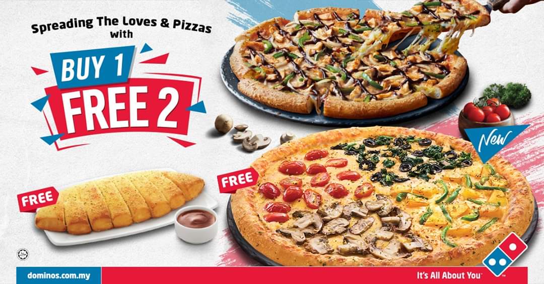 To have an extra discount when you opt for Dominos pizza delivery just scan through the number of coupons available for Dominos Malaysia and choose the one that brings down your order amount to a significant low. Dominos Buy 1 Free 2 is the deal for you. Buy 1 Xtra Large Free 1 Regular and 1 Bread Side Enjoy this limited time promotion with your friends and family.