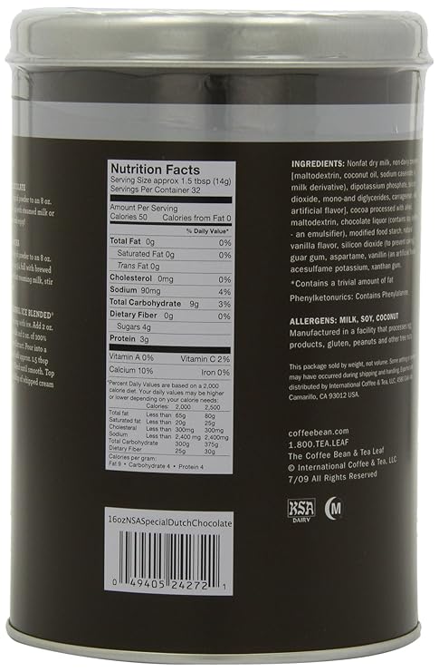 The Coffee Bean Tea Leaf Vanilla Powder w No Sugar Added. Add 15 tbsp of chocolate powder to an 8 oz. 9 Net Carbs Per Serving.